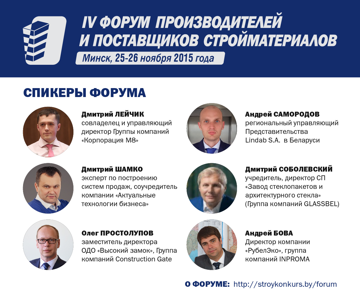 Программа Форума в 2015 году станет уникальной по ряду направлений, в том числе - составу участников. Прозвучат доклады более десяти владельцев и топ-менеджеров производственных предприятий строительной отрасли. Среди них: Дмитрий Лейчик («Корпорация М8»), Александр Власенко («СКТ-Стандарт»), Дмитрий Соболевский (Группа компаний Glassbel), Олег Простолупов («Высокий замок»), Дмитрий Шамко (экс-Isover) и другие. В основу их выступлений ляжет анализ реальных проблем и варианты их решения, проверенные экспертами на собственном опыте.