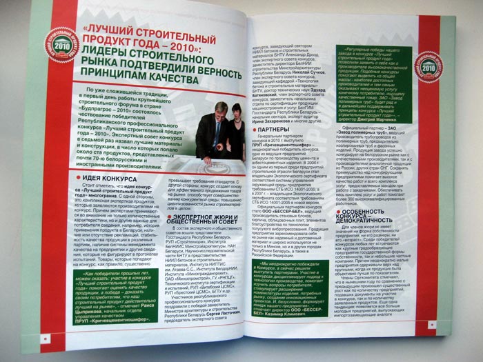Оргкомитетом проведена информационно-рекламная кампания по освещению итогов Конкурса-2011. Публикации с перечнем продуктов и предприятий-победителей появились в ведущих и наиболее популярных СМИ: - Республиканской газете «СБ: Беларусь сегодня» («Советская Белоруссия») (тираж свыше 400.000.экз.) - Издании Совета Министров – Республиканской газете «Рэспублiка» (50.000 экз.) - Ведущих строительных журналах: «МАСТЕРСКАЯ. Современное строительство» (4.000), «Мастерская. Строим дом» (16.000), «Мастерская. Оконный рынок» (1.500), «Вся стройка и ремонт» (10.000) и др. - Ведущих специализированных газетах: «Республиканская строительная газета» (3.500), «БСГ. Строительная газета» (3.000), «Строительство и недвижимость» (1.500) и др. - Интернет-порталах: Vashdom.tut.by, Proektant.by, Prodom.by, Molot.by.