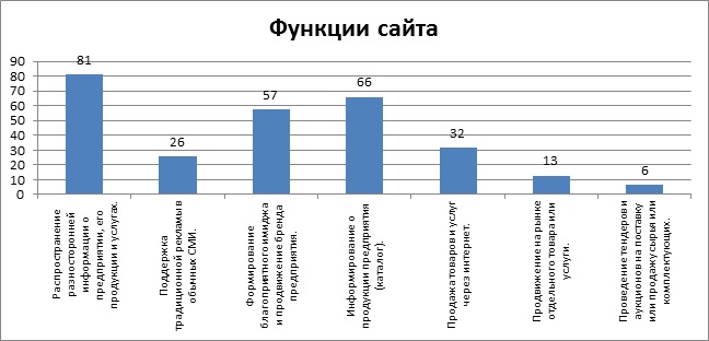 Основной функцией сайта среди опрошенных предприятий является распространение разносторонней информации о предприятии, его продукции и услугах (81%), - т.е. имиджевая функция, на втором месте по значимости является информирование о продукции предприятия. 66% предприятий размещают на сайте каталог своей продукции. Наименьшее количество предприятий проводит тендеры и аукционы на поставку или продажу сырья или комплектующих (6%).