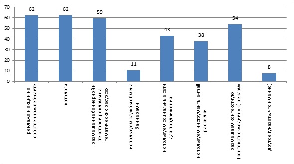 Прошло время, когда предприятия разрабатывали сайты-визитки и рекламировали свою продукцию только на нем: теперь они активно используют и другие доступные инструменты - размещают рекламные баннеры и пресс-релизы на отраслевых интернет-площадках, размещают информацию в тематических каталогах, дают контекстную рекламу, используют социальные сети и емэйл-маркетинг для продвижения товаров (40-60%).