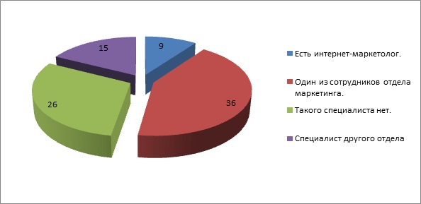 36% опрошенных предприятий возглагают обязанности по продвижению продукции через интернет на сотрудников отдела маркетинга. Лишь 9% предприятий имеют в своем штатном расписании интернет-маркетолога, а 26% вообще не имеют такого специалиста. Остальные предприятия привлекают для решения этих вопросов других специалистов предприятия: IT-отдел, начальника отдел продаж, руководители направлений, либо обращаются в сторонние организации.
