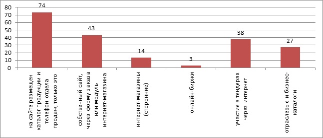 Большинство предприятий, которые пытаются продавать продукцию через сайт размещают на сайте каталог продукции и контакты отдела продаж (74%). Около половины предприятий имеют на сайте форму заказа либо модуль интернет-магазина (43%). В то время как сторонними магазинами и онлайн-биржами пользуются очень мало предприятий (14% и 3% соответственно).