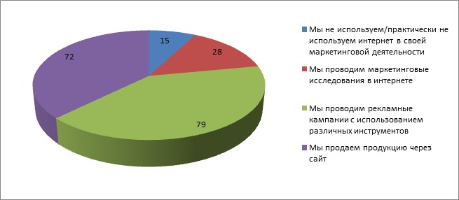 Большинство компаний использует инструменты интернет-маркетинга для проведения рекламных компаний (79%) и продажи продукции через сайт (72%). 28% предприятий указали, что проводят маркетинговые исследования в интернете.